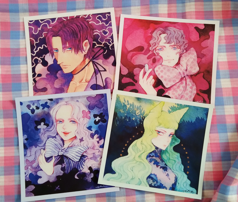 You get a set of 4 mini prints, printed in 250g cardstock, matte laminated. They vary in size since they are printed the exact size I painted them traditionally: